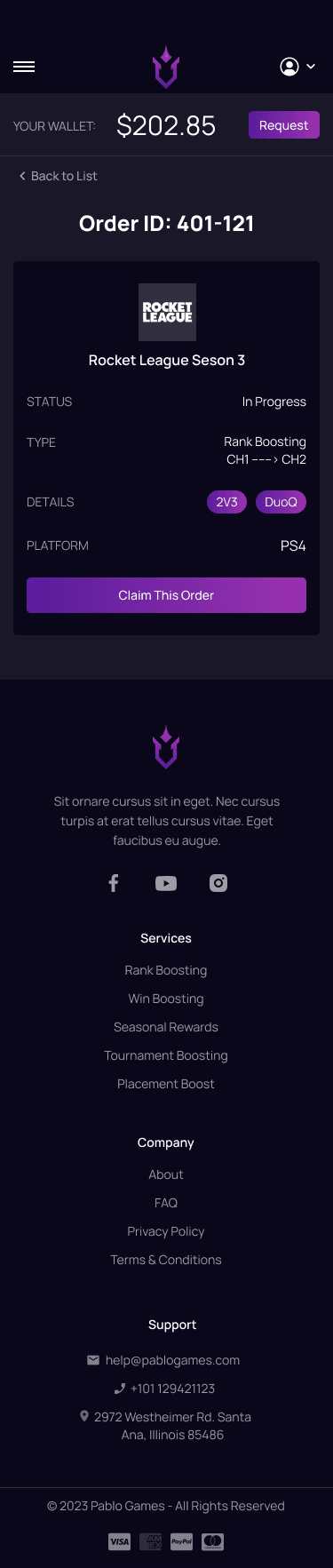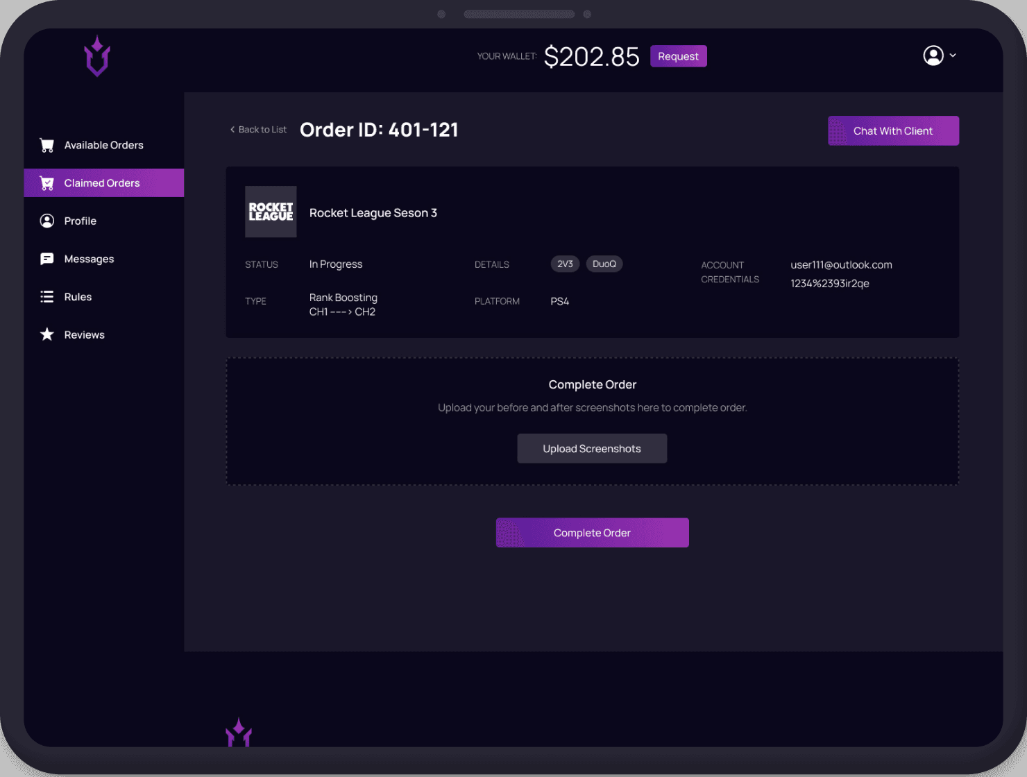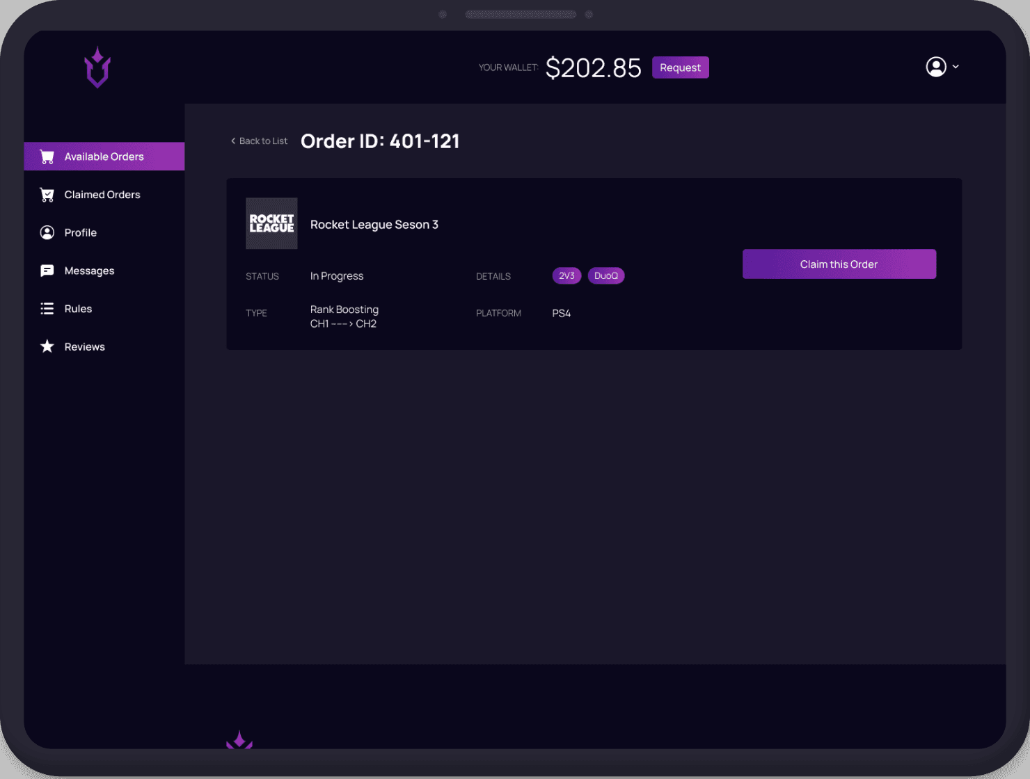 Players dashboard Claimed orders