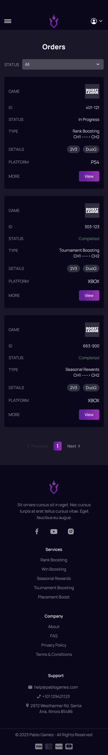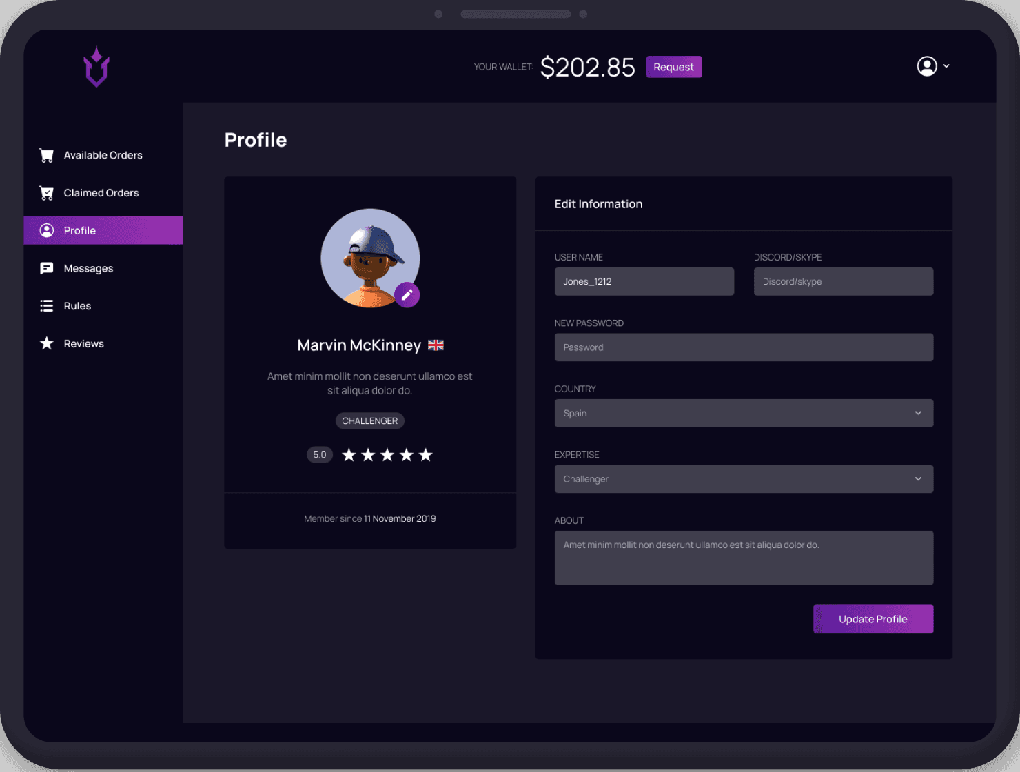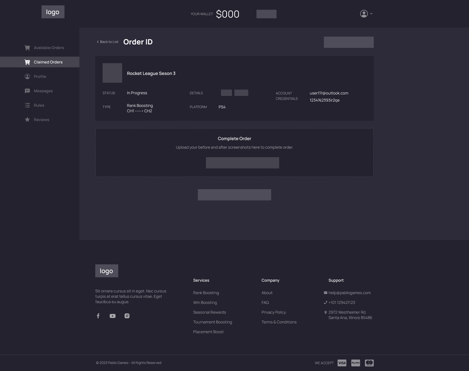 Players dashboard Claimed orders